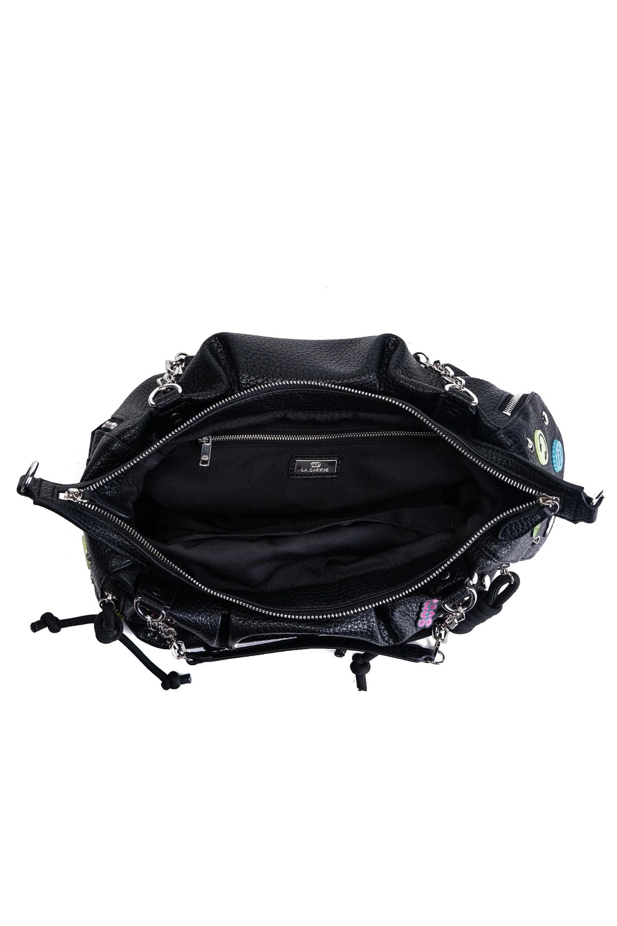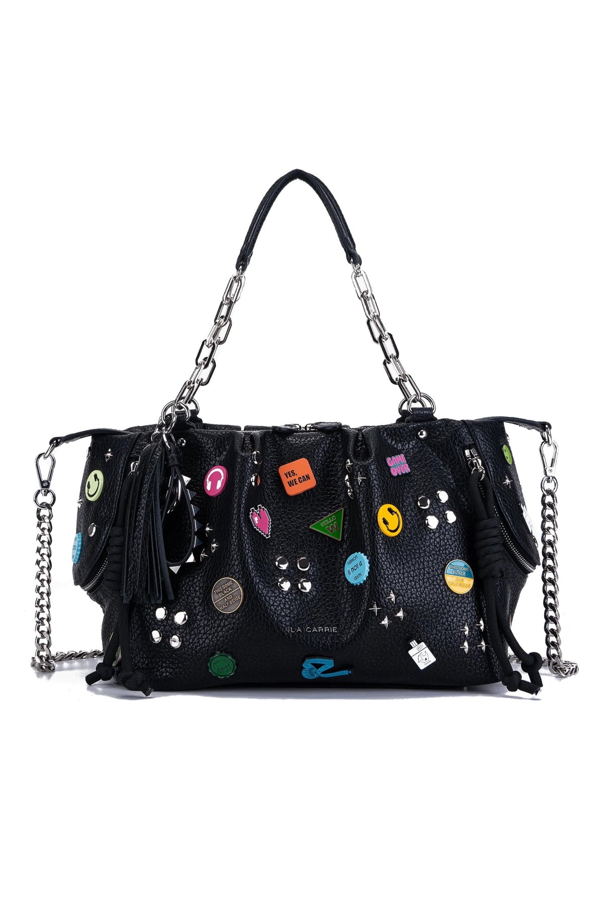 Borsa shopping con doppi manici in ecopelle martellata, con spille colorate applicate e chiusura a zip