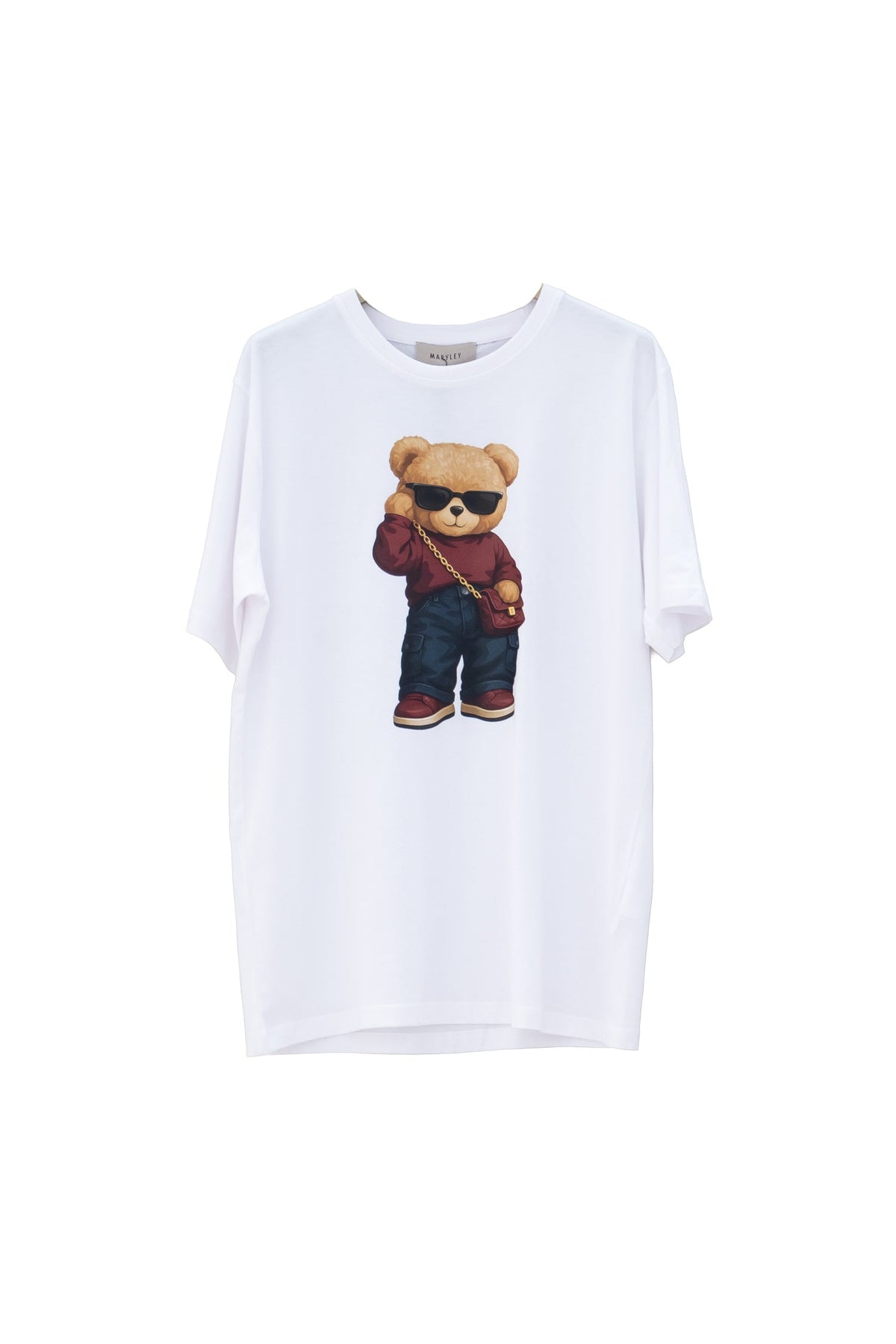 Ironica, urbana, iconica. Questa t-shirt bianca donna, realizzata in 100% cotone, si distingue per la sua stampa centrale raffigurante un orsetto in versione streetwear: occhiali da sole, giacca rossa, jeans e sneakers, con catena dorata e posa sicura. Il design fonde estetica cartoon e dettagli fashion, creando un capo dal tono giocoso e contemporaneo.