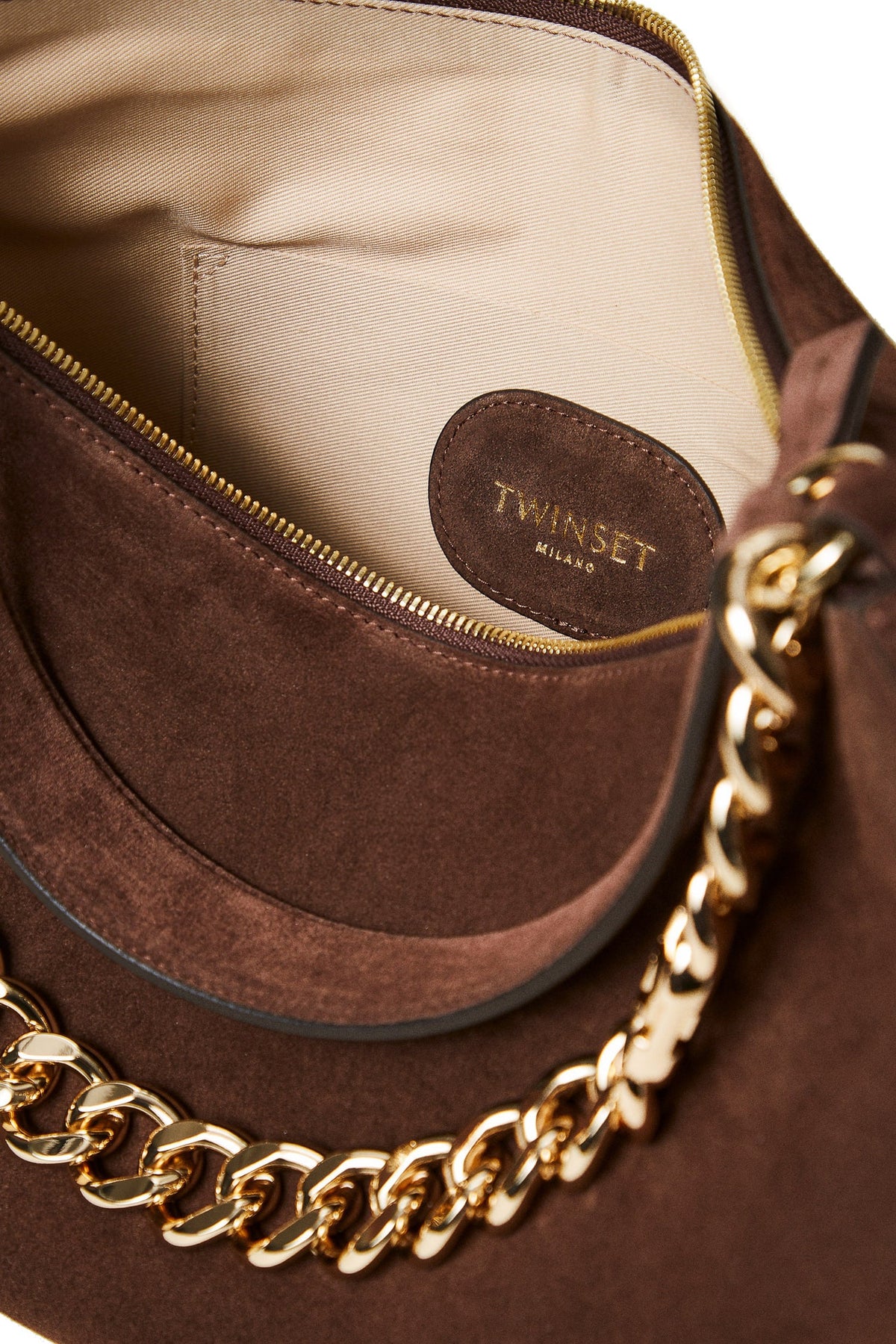 Borsa hobo 'Liliane' made in Italy, realizzata in pelle scamosciata con trattamento anti stingimento. Il corpo è realizzato a colonna con un rinforzo in microfibra, con logo impresso a caldo, e foderato con un twill in misto cotone. Ha due manici staccabili, da indossare simultaneamente o separati per diverse interpretazioni di styling: uno in pelle sagomato e imbottito, l'altro è una catena in lega leggera in galvanica oro con l'Oval T inserito tra le maglie.