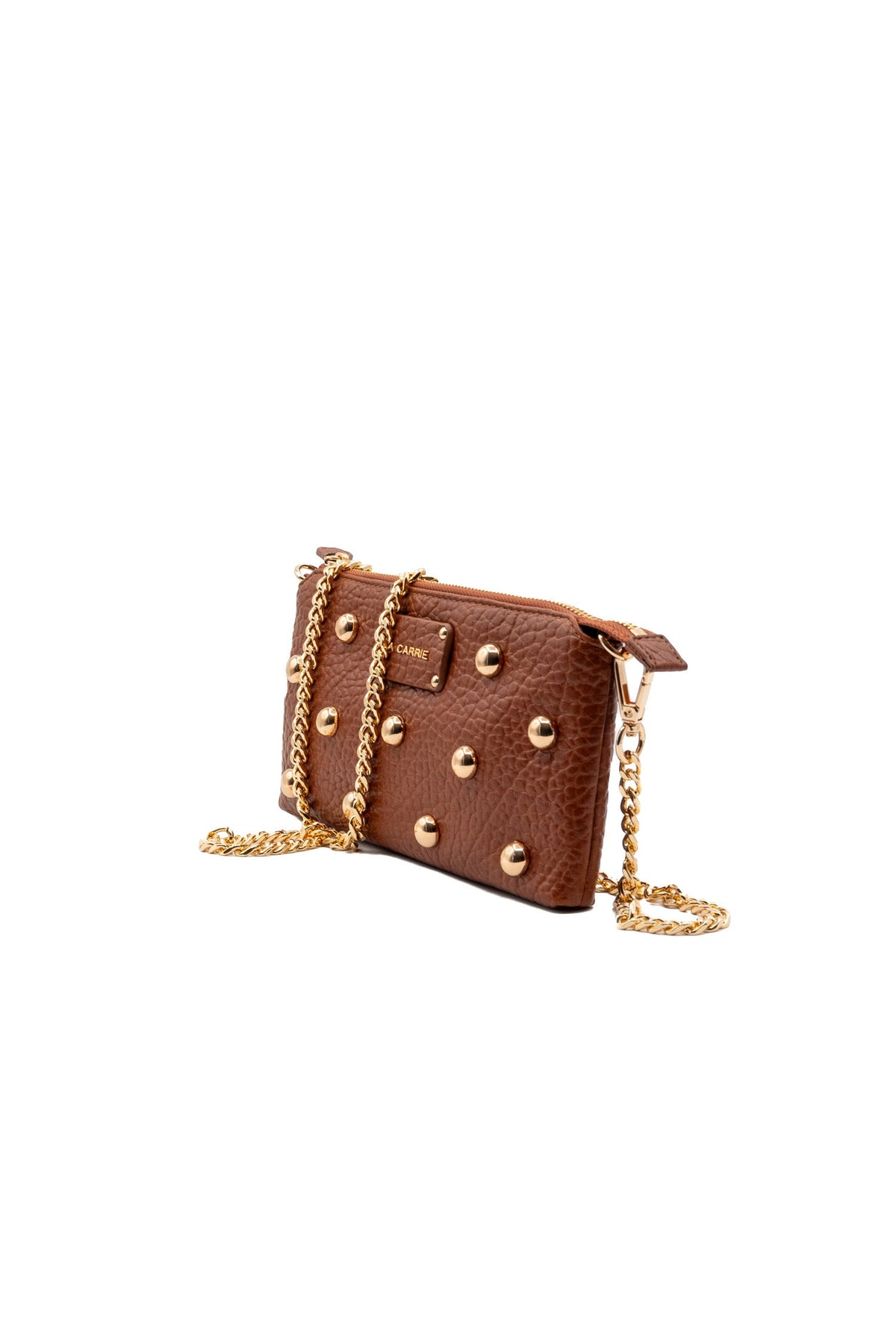 Portafoglio grande in ecopelle martellata con borchie oro, chiusura a zip e tracolla rimovibile