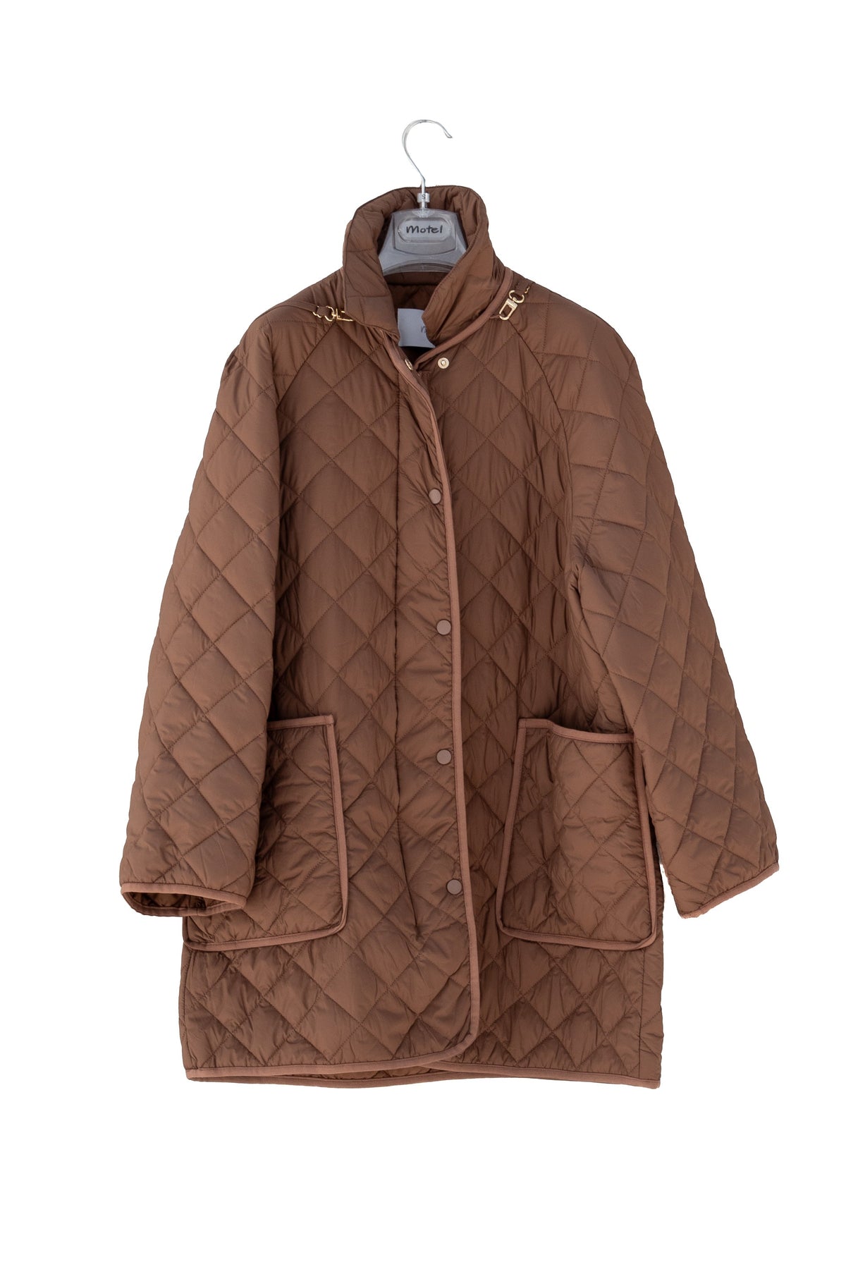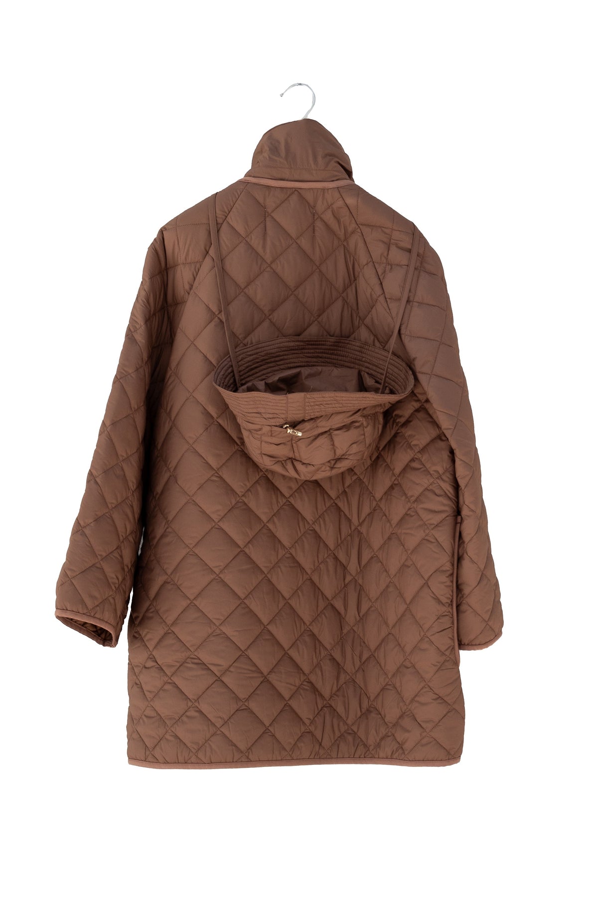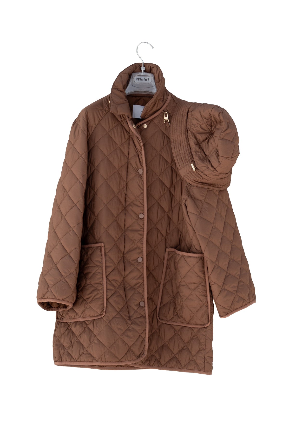 Piumino in tonalità moro, caratterizzato da una trapuntatura a rombi che dona struttura e un'estetica pulita ma ricca di texture. Realizzato in 100% poliestere per tessuto esterno, fodera e imbottitura, offre leggerezza, praticità e una buona protezione nelle giornate fredde.