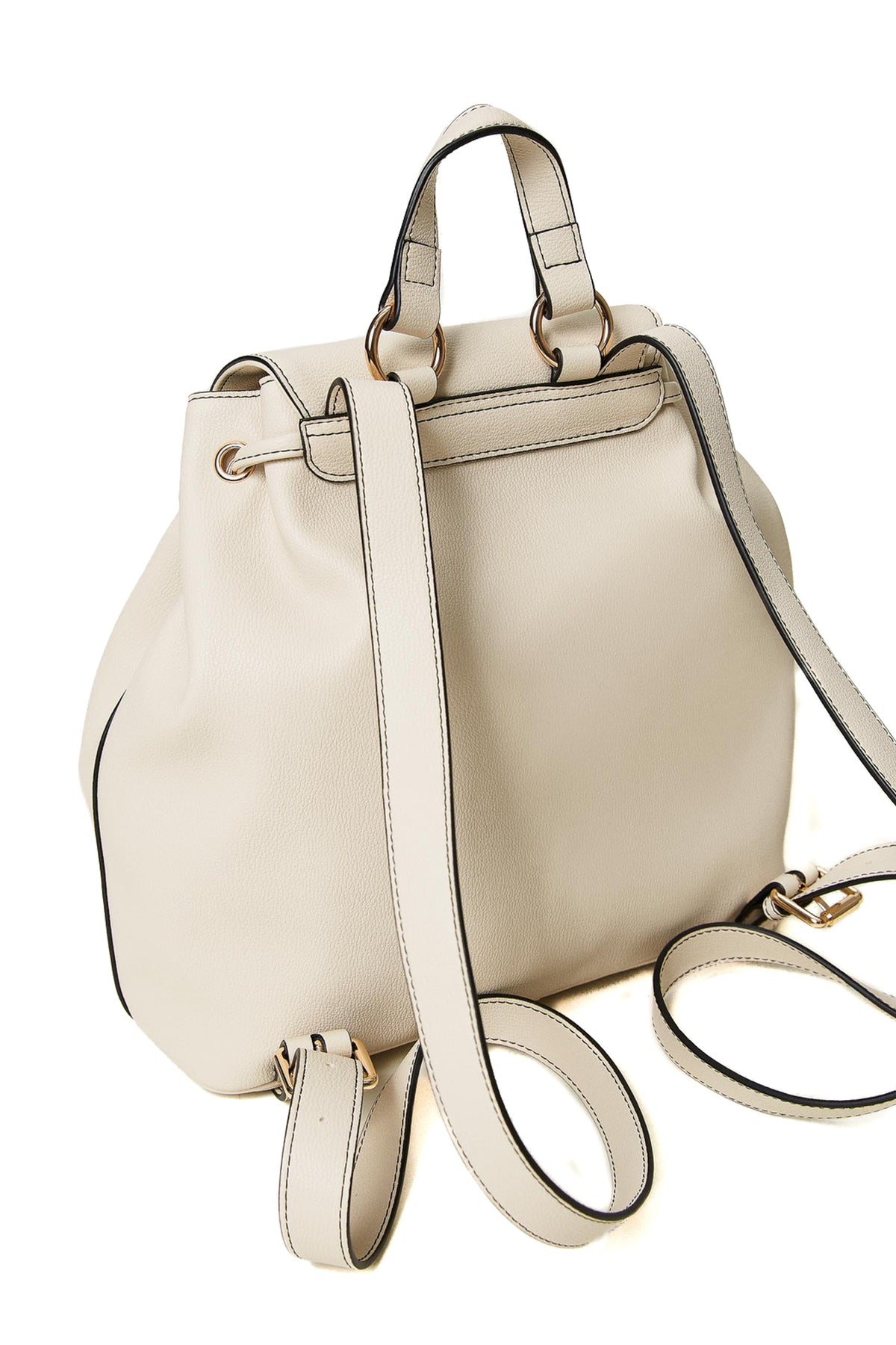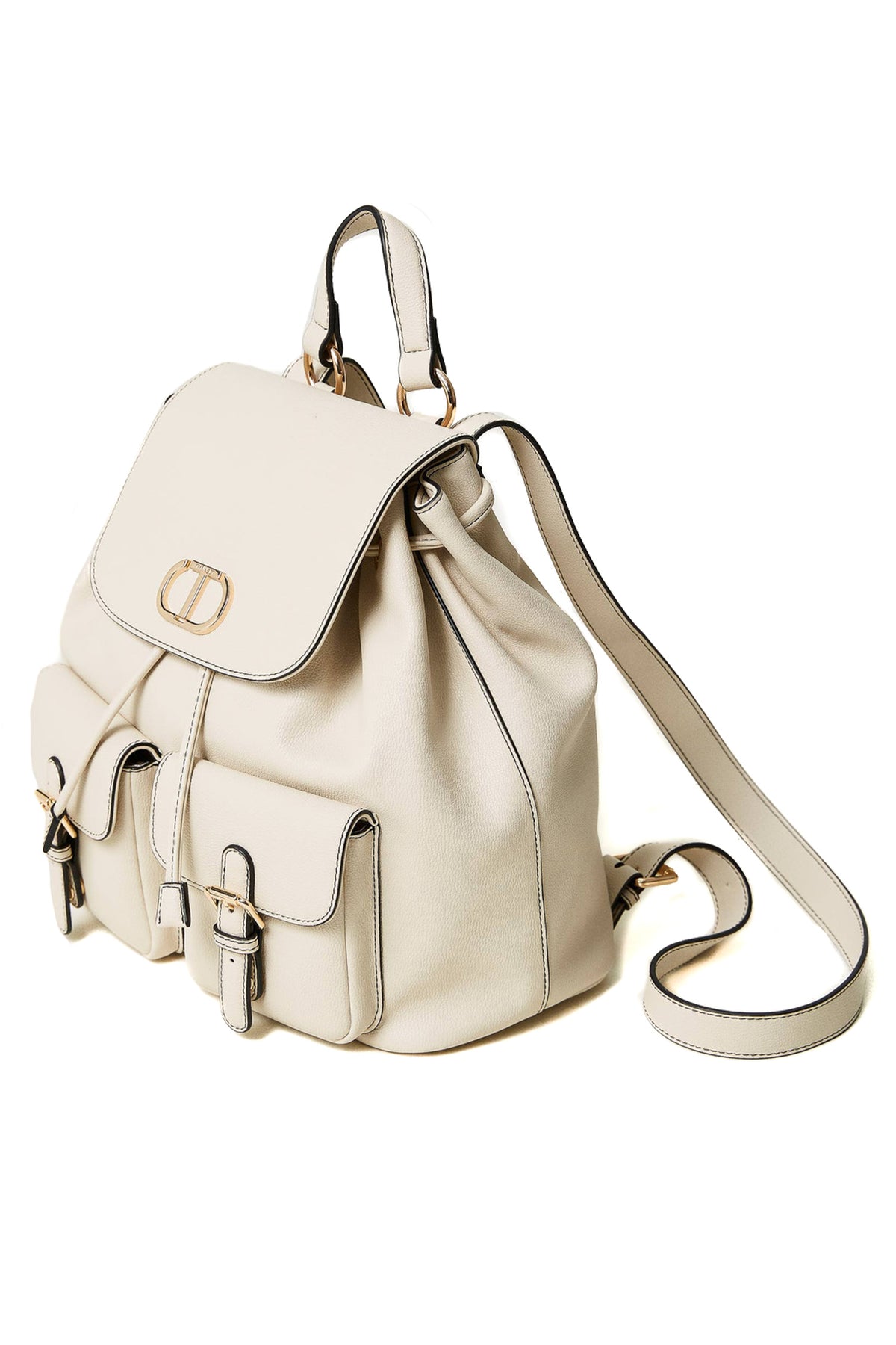 Zaino effetto pelle con patta, magnete e coulisse, tasche davanti con cinturini, spallacci regolabili, logo Oval T.