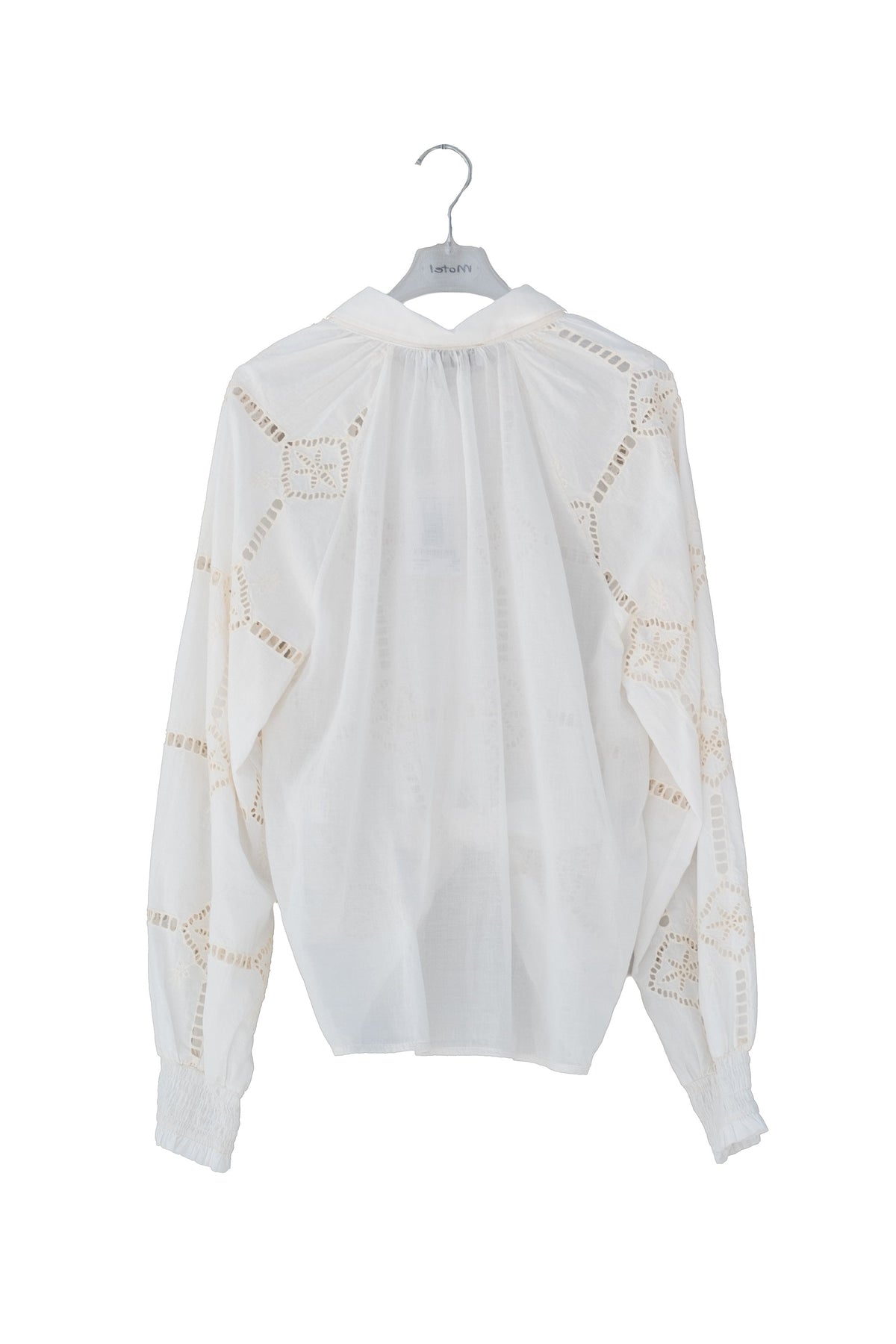 Camicia bianca in cotone con ricamo traforato e nodo frontale