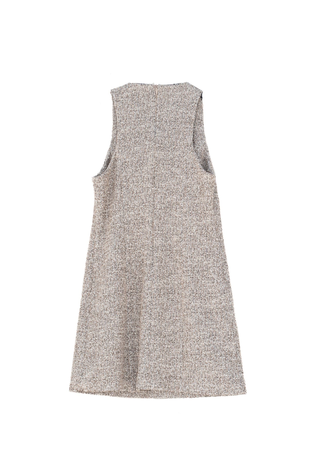 Sleeveless gray bouclé dress with a round neck and back zip closure. The structured fabric lends an elegant and refined look, while the straight fit understatedly flatters the figure. Front pockets with decorative buttons add a chic, contemporary touch. Ideal for work or a sophisticated urban look.