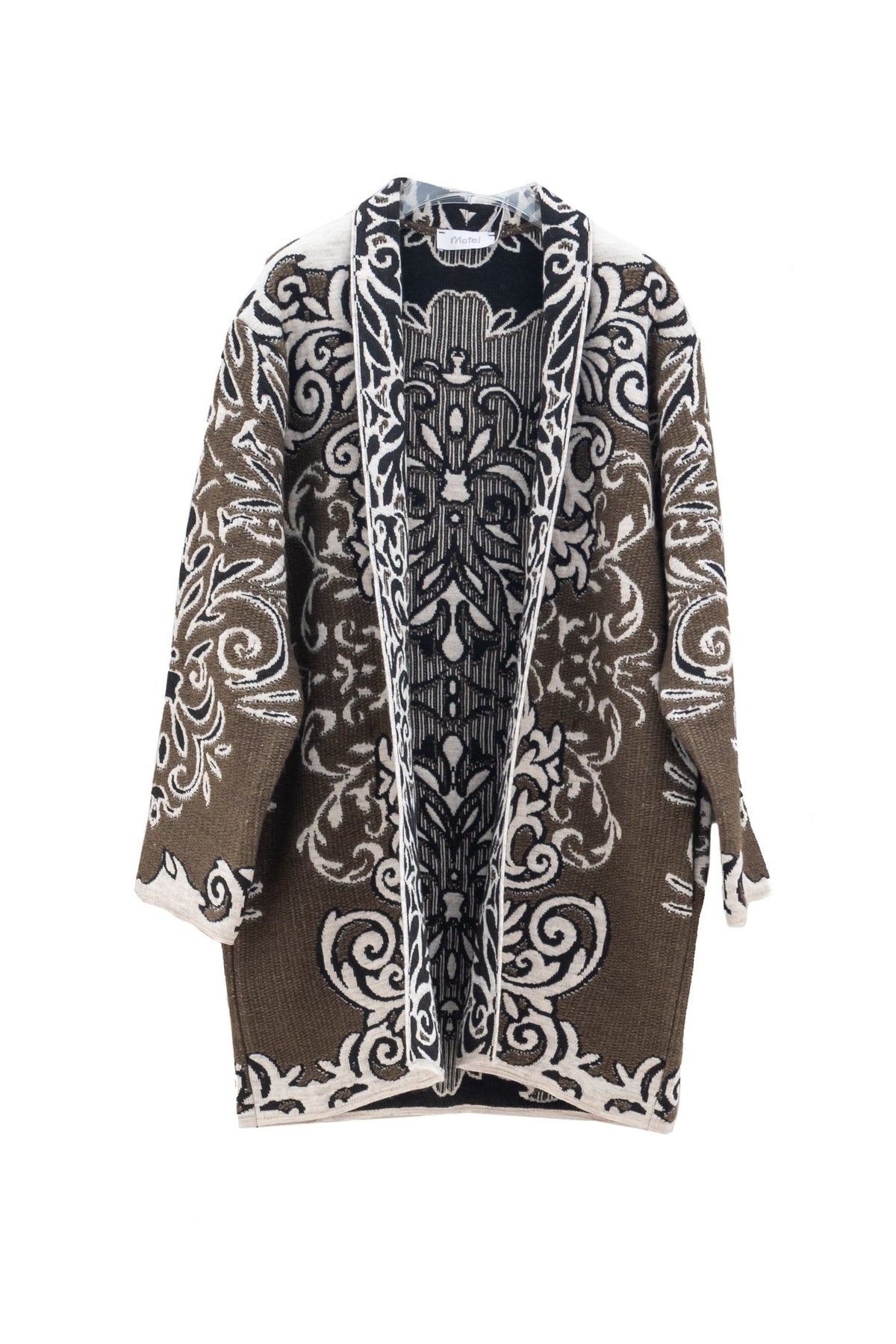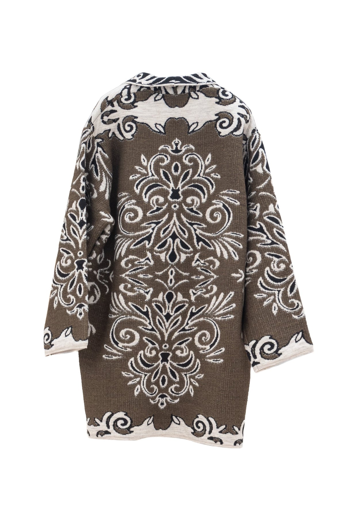 Green alpaca and wool blend coat with white Baroque motif