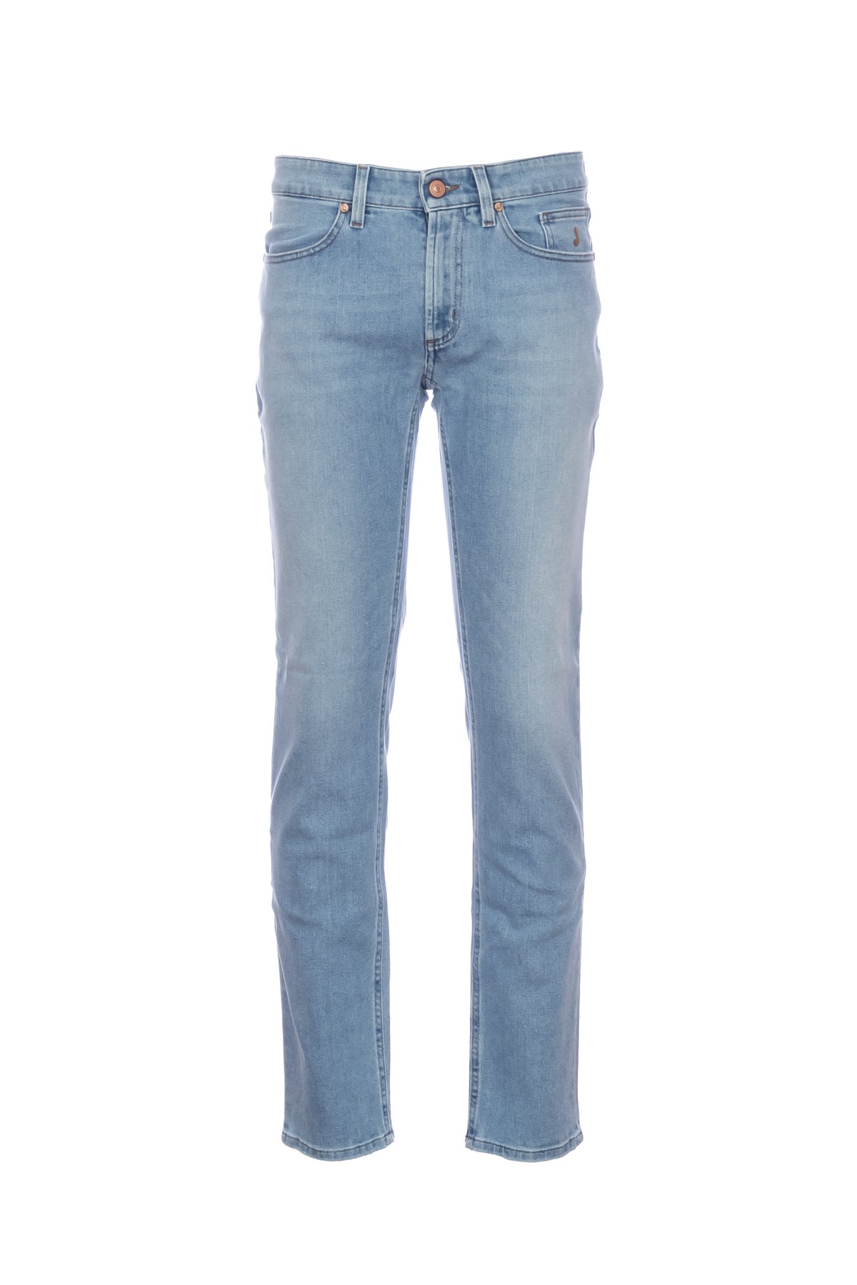 Pantalon 5 poches coupe slim confectionné en denim bleu écologique. Le vêtement se caractérise par une ceinture arrière en cuir régénéré, une ceinture interne avec le nom et la coupe du modèle brodés dans le ton des coutures et le logo J brodé sur la poche gauche.