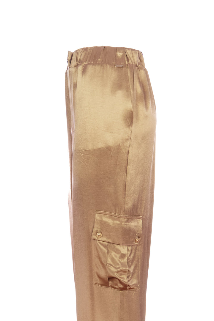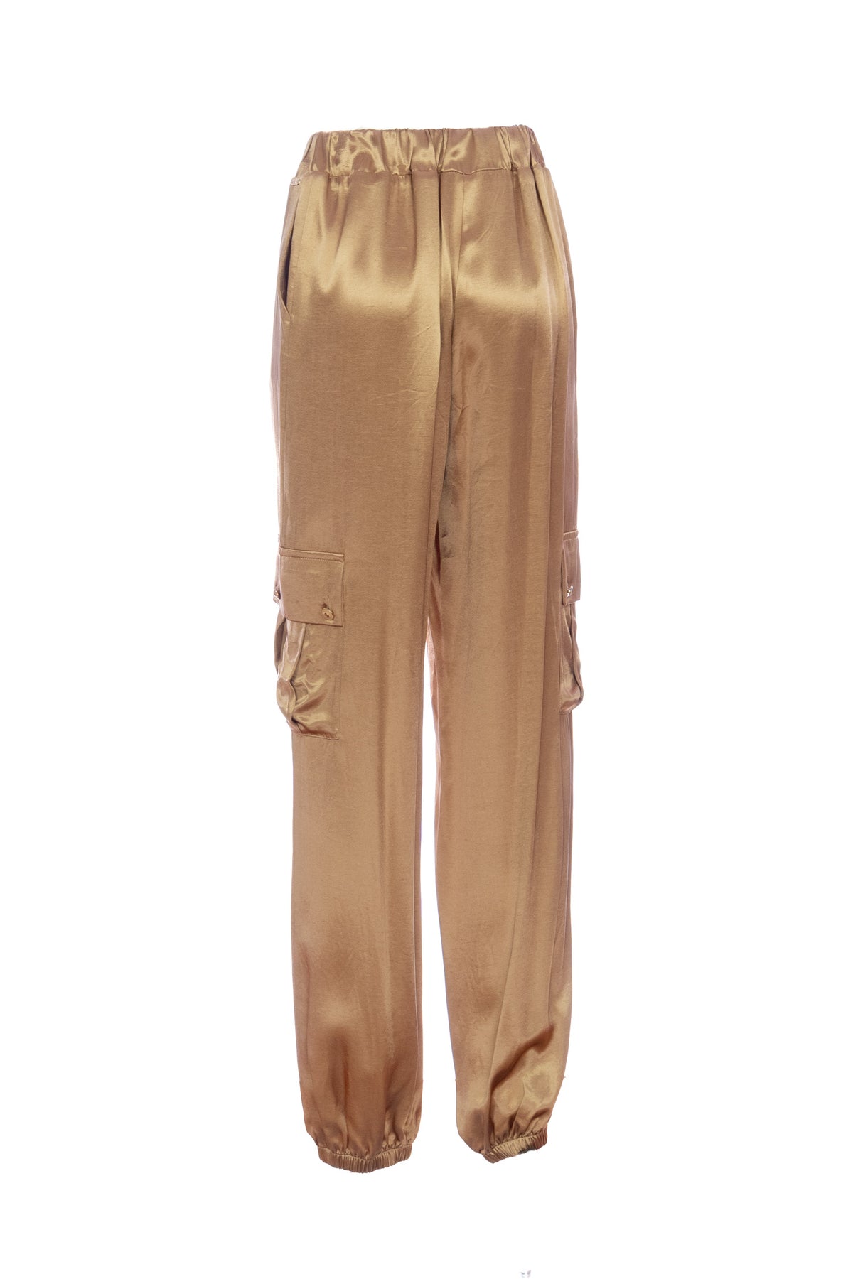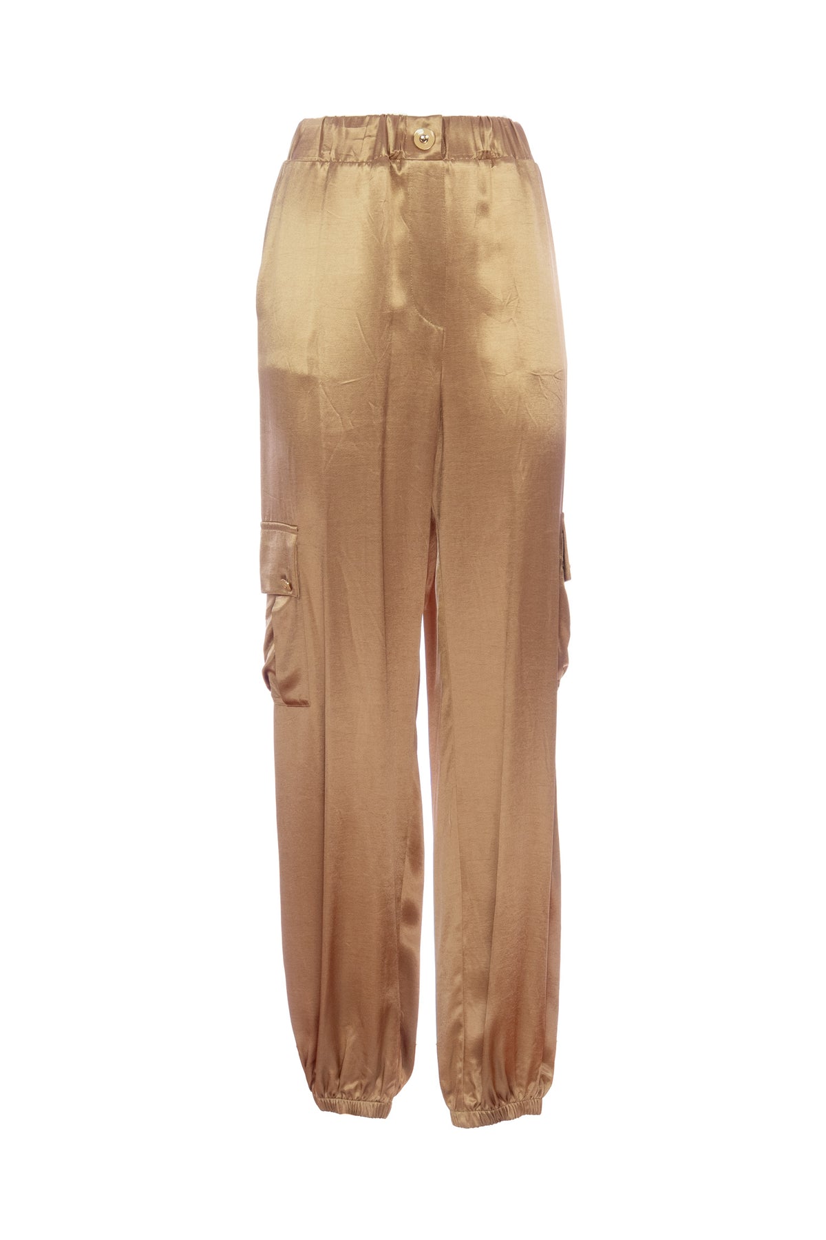 Pantaloni cargo in raso, vita alta con elastico, tasche alla francese sui fianchi, tasconi laterali, e con fondo stretto.